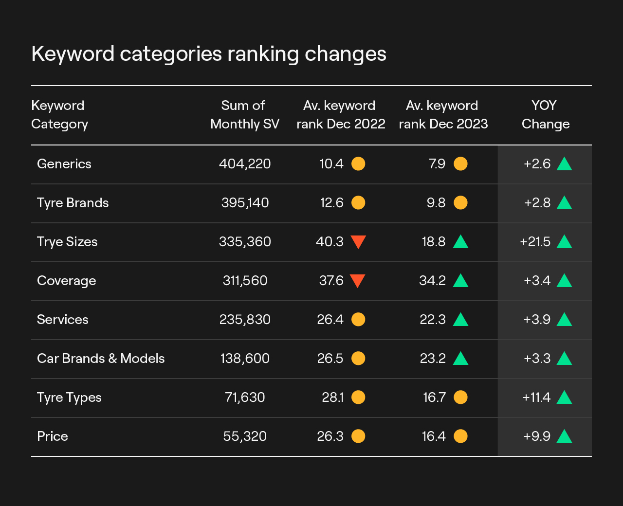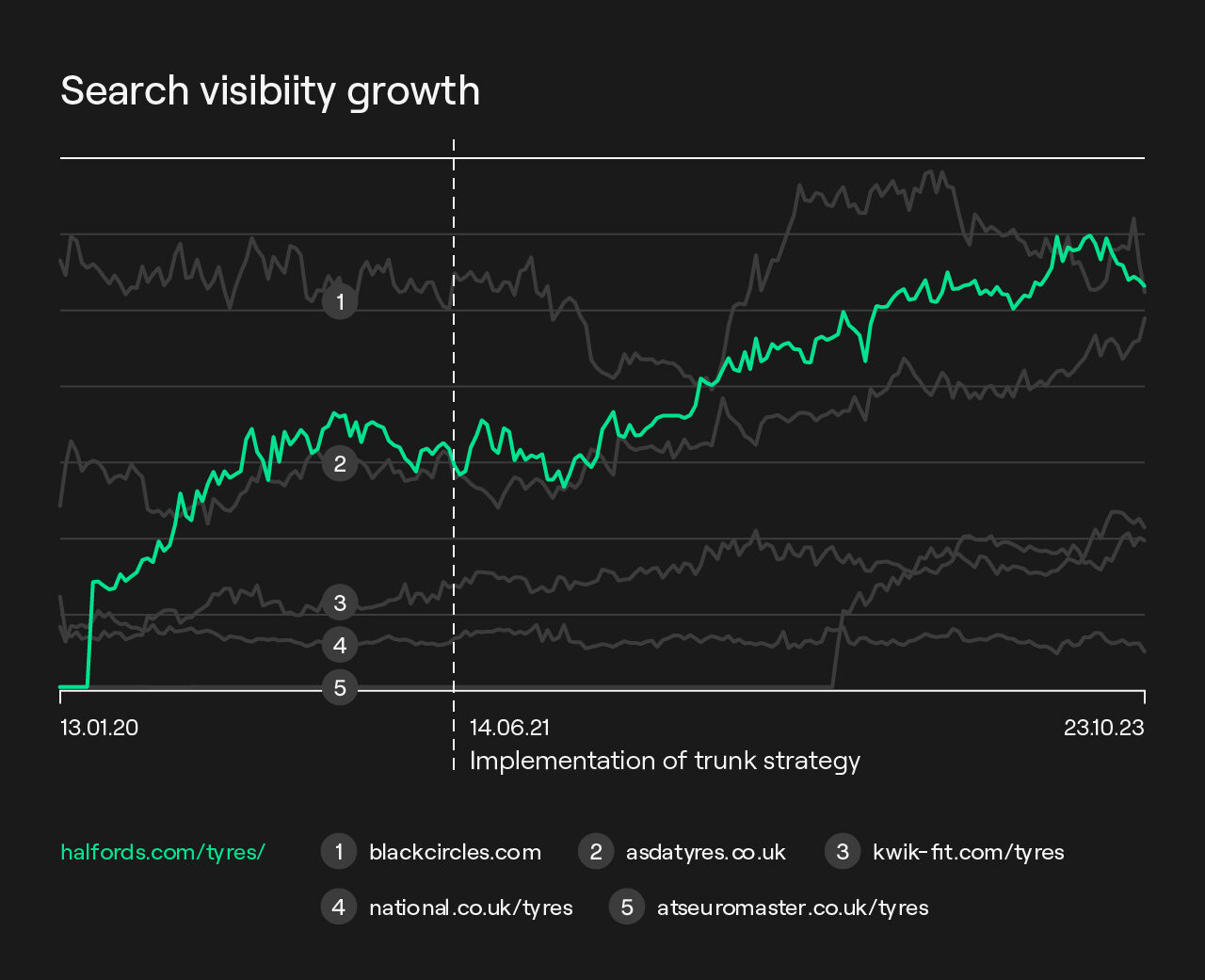 With a huge audience to target, our organic strategy needed to be creative and flexible for a wide audience. Trunk’s mission was to outperform key competitors and achieve a 15% increase in organic search sessions to tyre pages in 12 months, a 15% uplift in revenue from tyre sales over the same period, plus the top spot in organic search for tyres, surpassing Black Circles and Asda Tyres.