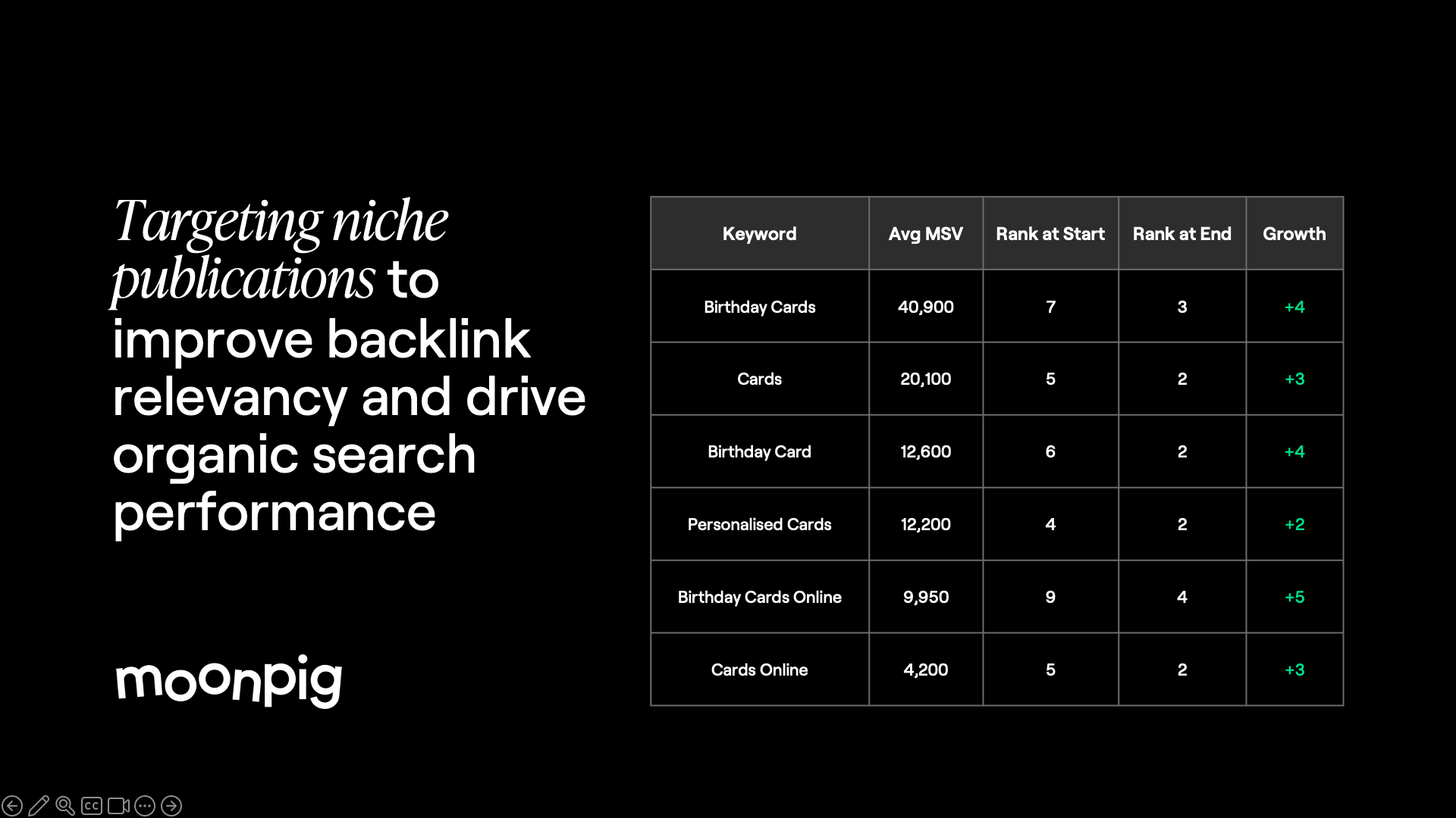 This allowed us to target previously unlinked, highly relevant domains, enhancing the quality and diversity of Moonpig’s backlink profile.