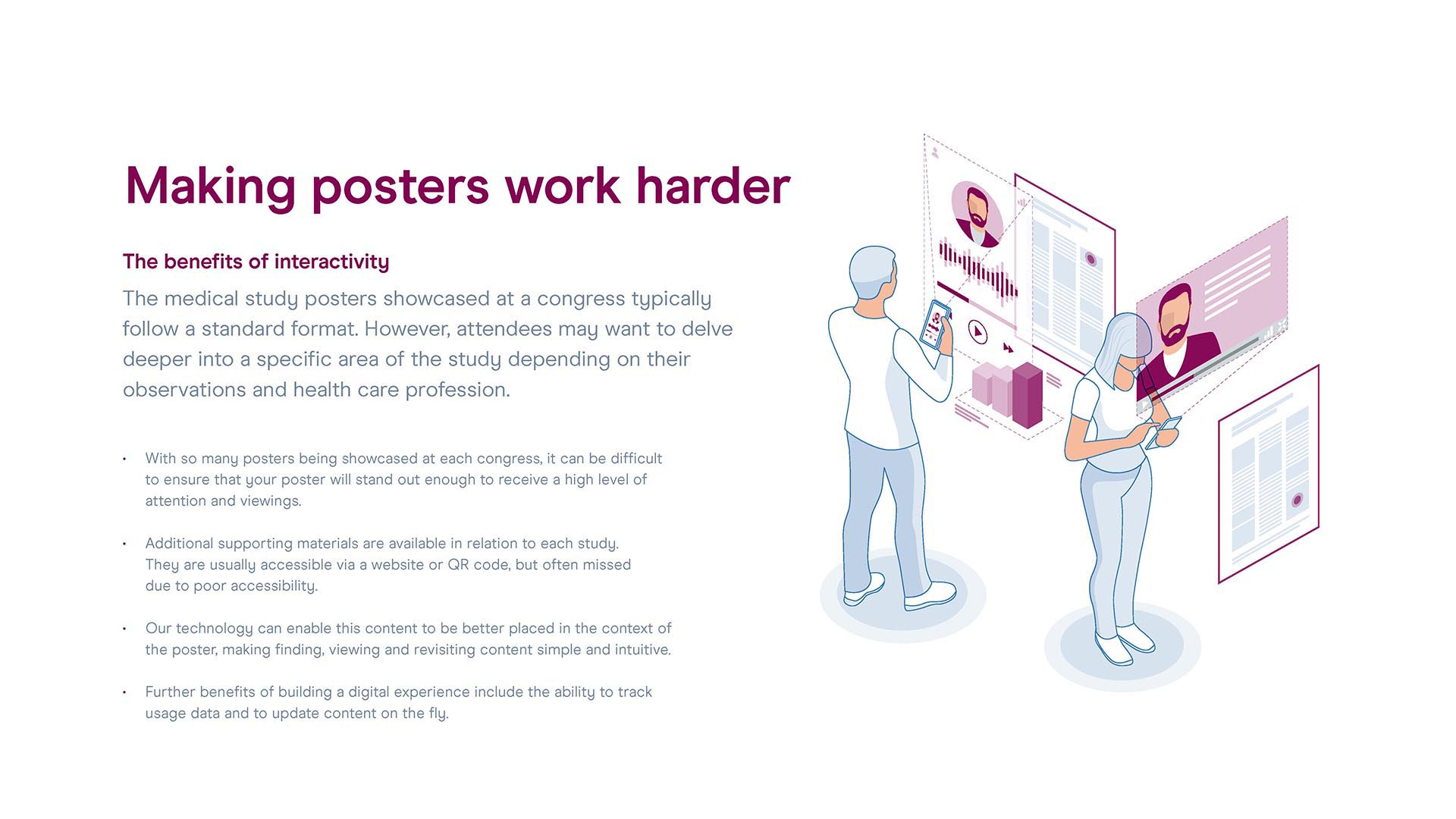 At medical congresses, the volume of information can be overwhelming. Traditional posters, while informative, struggle to stand out in crowded exhibition spaces. Healthcare professionals often miss out on essential data due to information overload or the static nature of the posters. Standard formats do not allow for deeper engagement or personalisation based on the user’s background or interest, leading to a lower retention of presented data.